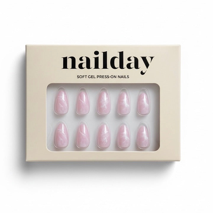 Droom weg met Candy Clouds, een zachte en dromerige manicure die perfect is voor jouw zoete zomermomenten. Deze medium almond press-ons hebben een uniek roze marmer effect dat doet denken aan suikerspinnen in de lucht bij zonsondergang. Elegant, zacht en toch opvallend: de ultieme match voor een minimal maar magische summer look.