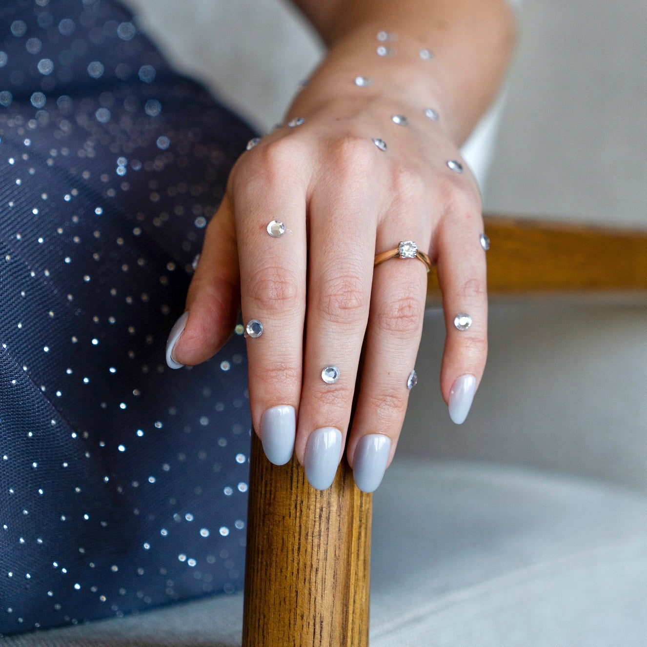 Selecteer voor elke vinger de press-on nagel die het beste past. Zit hij iets te wijd? Vijl dan lichtjes de zijkanten voor een perfect fit. - Aanbrengen met sticky tabs of lijm