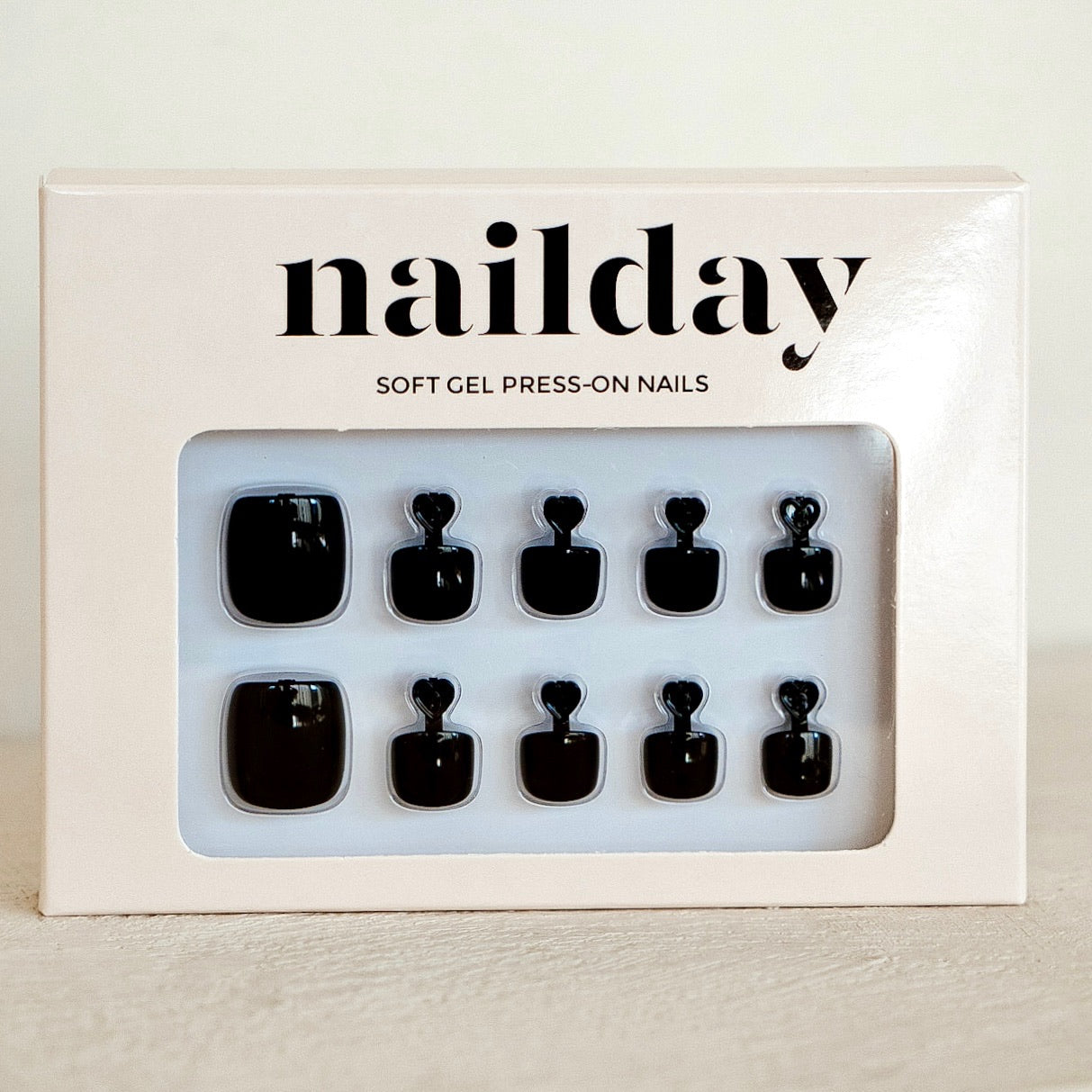 Voor de stijlvolle minimalisten: Noir is onze klassieke zwarte press-on pedicure die iedere outfit extra pit geeft. De glanzende diepzwarte finish is perfect voor open schoenen, vakanties of een night out.