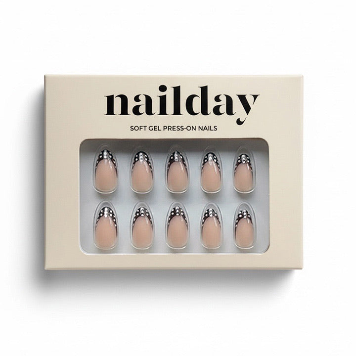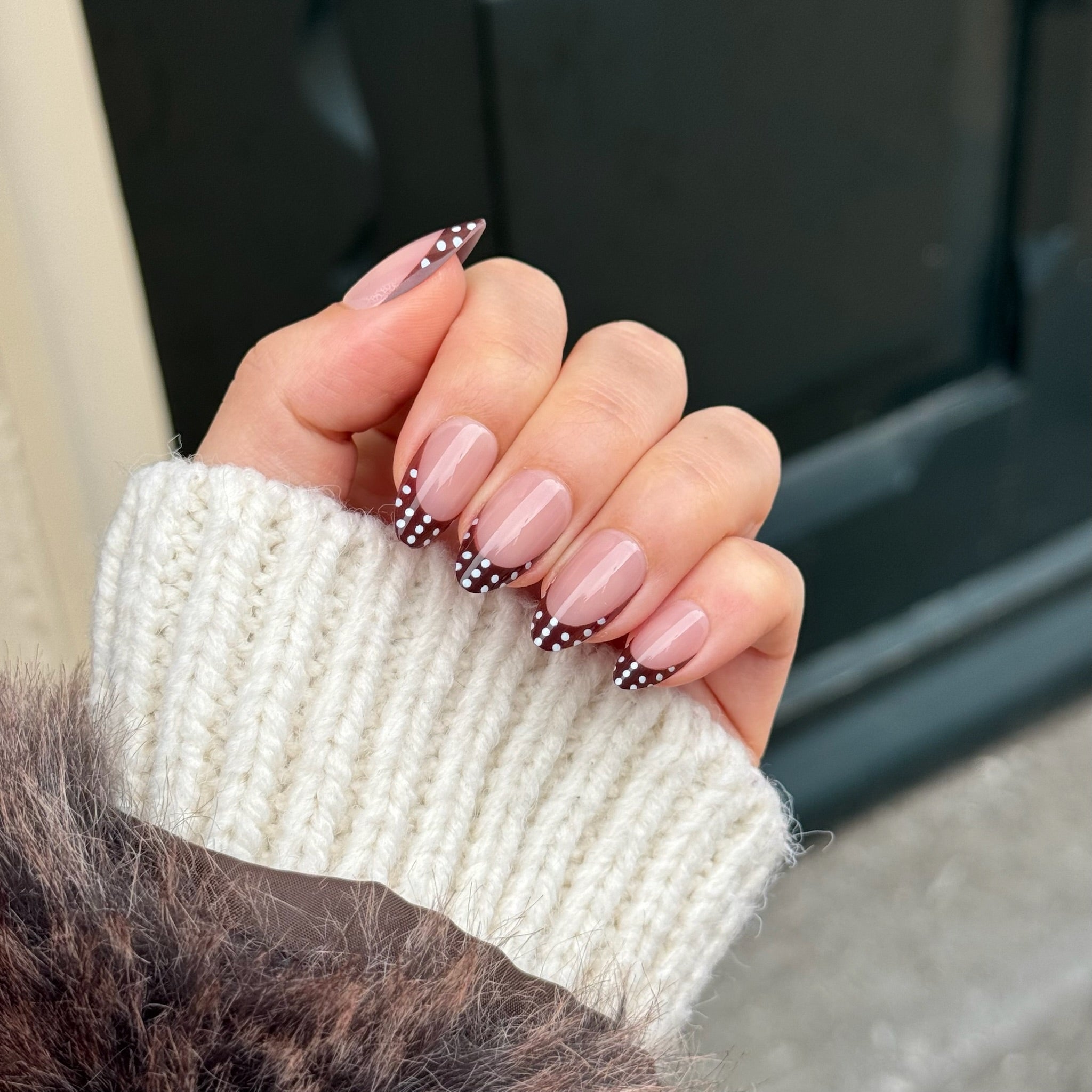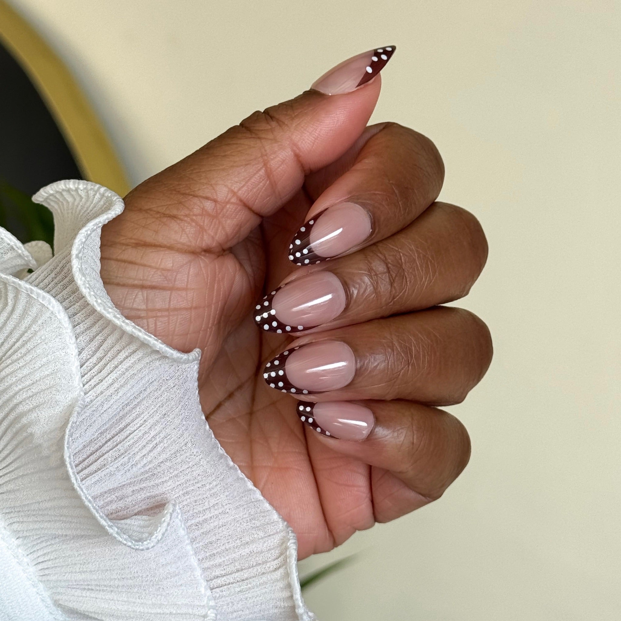 Een warme bruine french op een nude basis, afgewerkt met speelse witte polka dots voor nét dat beetje extra en een subtiele statement.