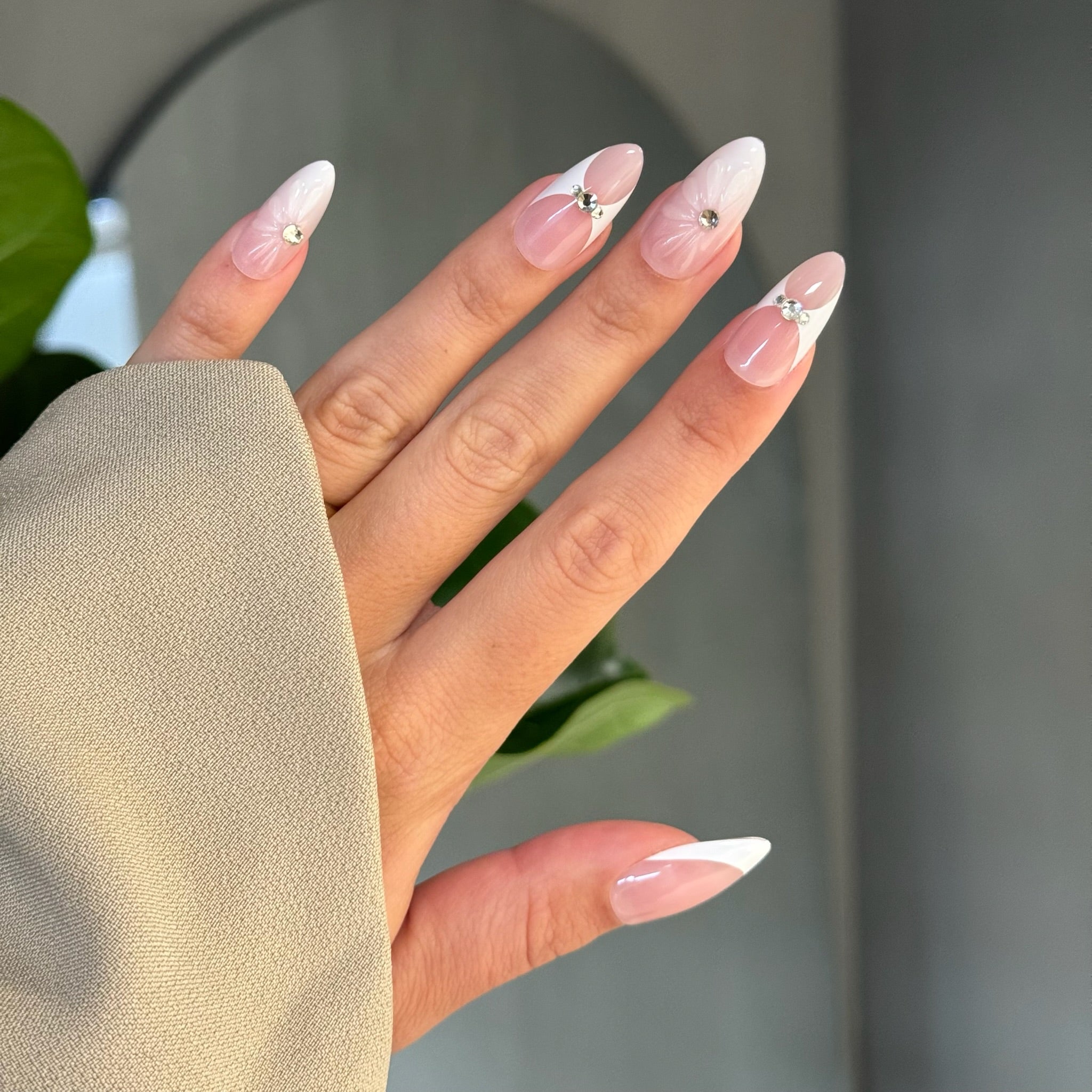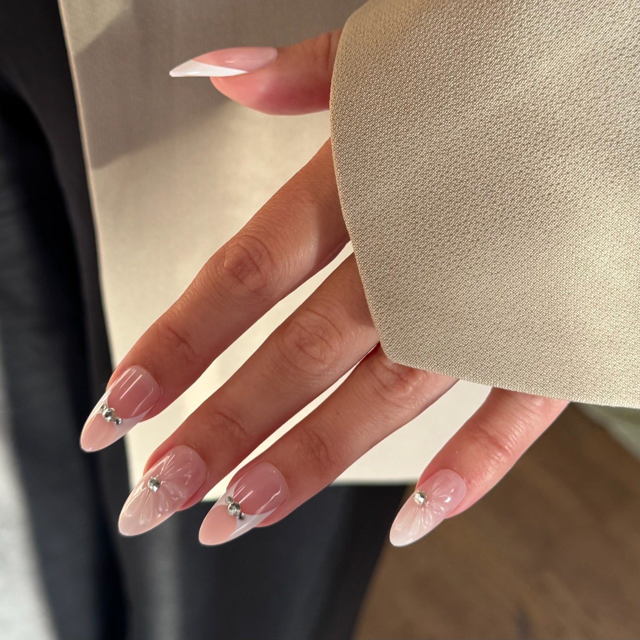 Een elegante combinatie van een zachte nude base met heldere witte diagonale french tips. Op een aantal nagels is een strass-steentje (diamant look) verwerkt evenals een subtiel 3D-bloemetje. Perfect voor wie houdt van verfijnde details met een glinsterende twist.