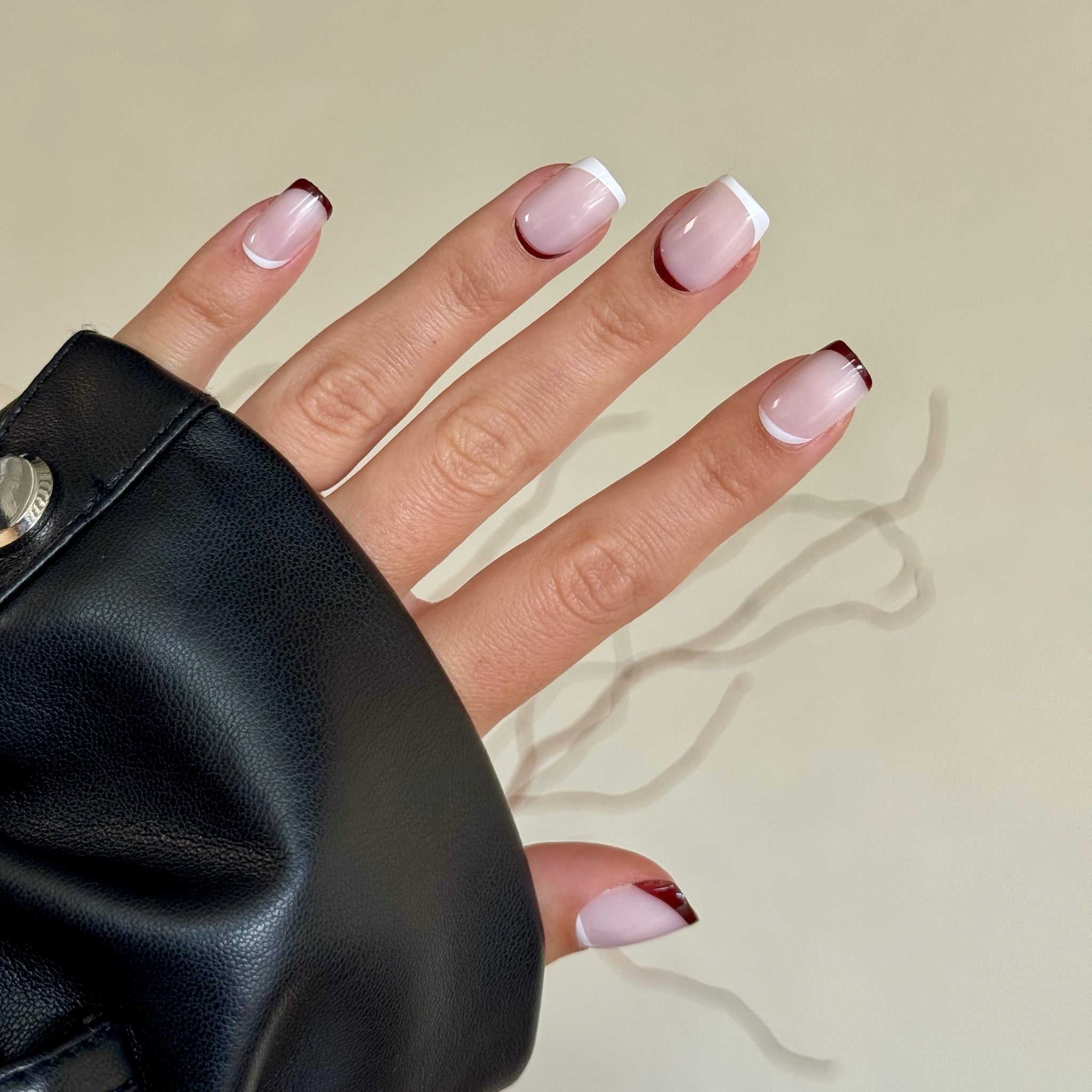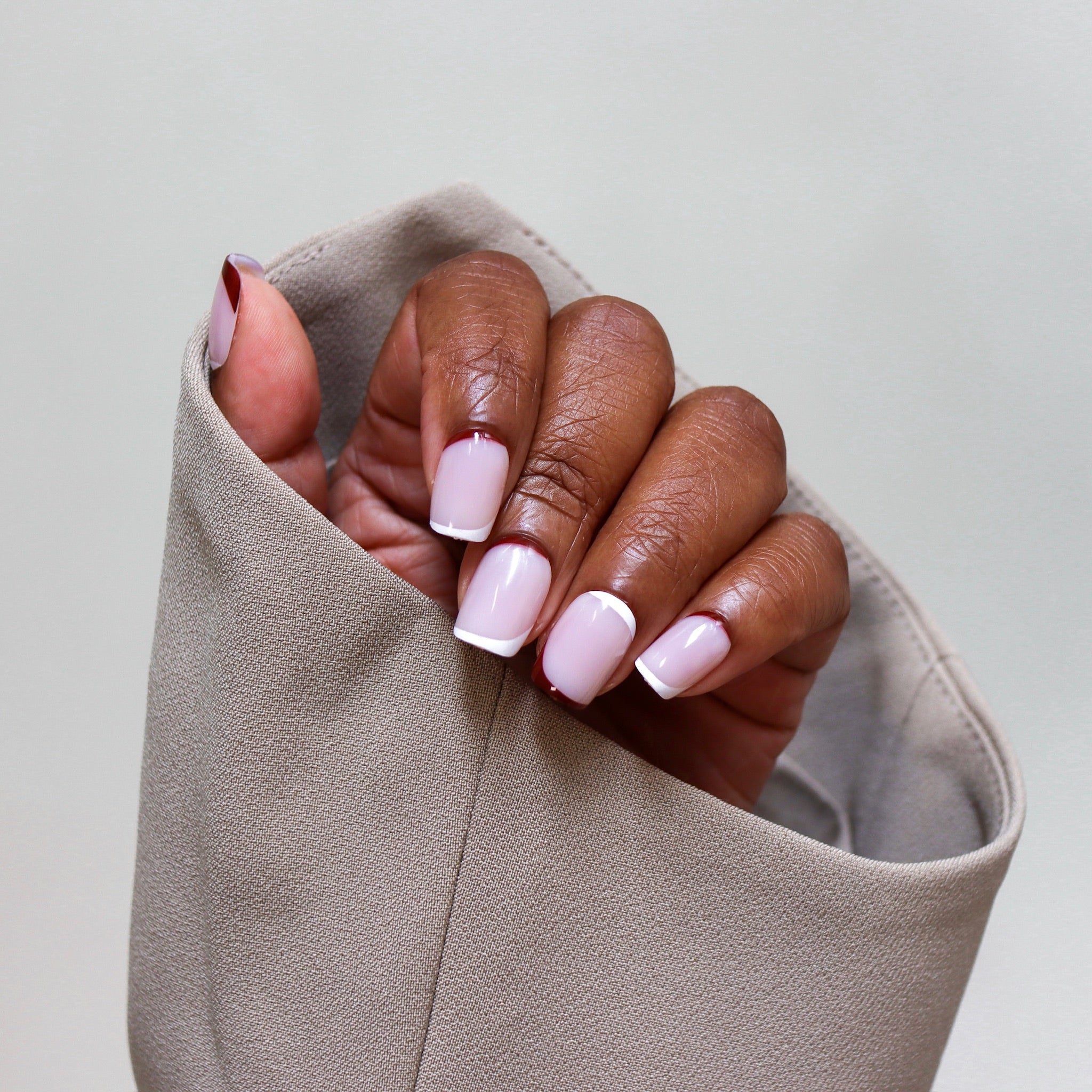 Double Trouble is jouw go-to set voor een subtiele twist op de klassieke French manicure. De korte square nagels combineren een roze/transparante basis met afwisselend witte en bruine tips.