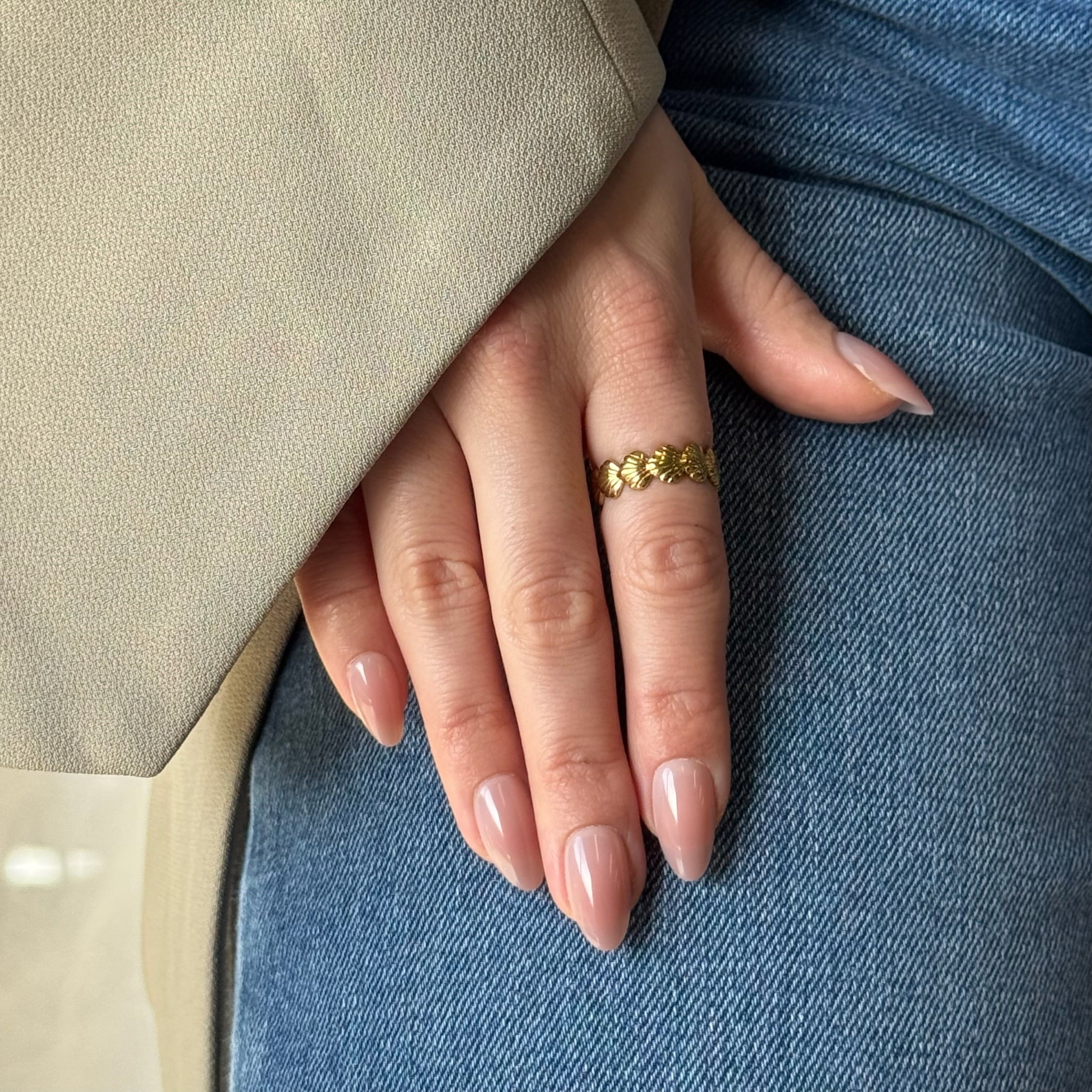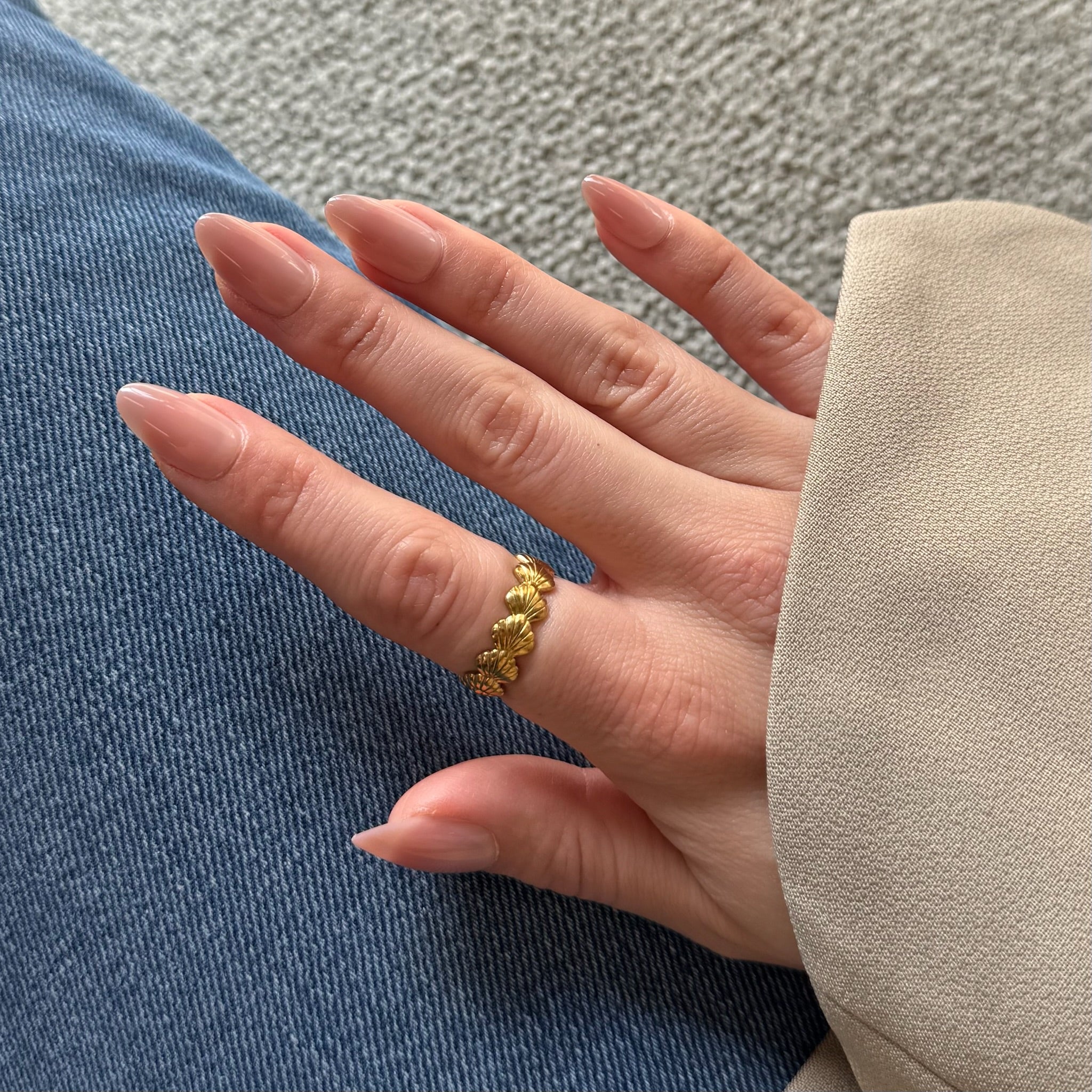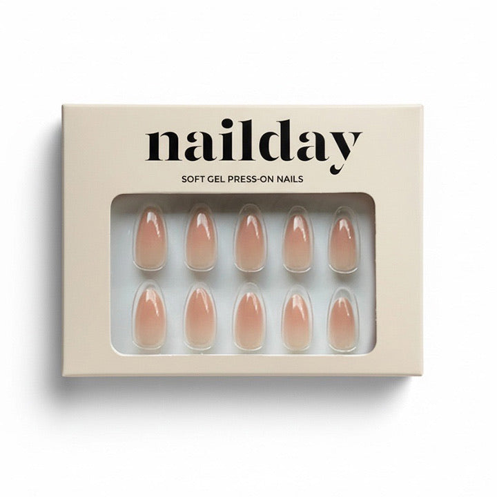 Romy in medium almond is de perfecte natuurlijke manicure. Een glossy nude tint met luxe BIAB-look en een subtiel ombre effect dat je nagels een natuurlijke en verzorgde uitstraling geeft.