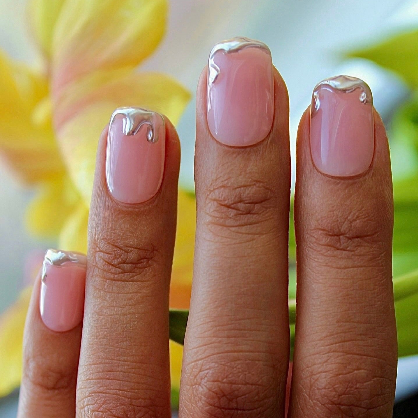 Dripping in silver,  de ultieme combinatie van minimalistisch en modern. Dripping in Silver heeft een zachte transparante basis met chroomzilveren swirl tips als nailart. De short square vorm is praktisch én stijlvol – perfect voor dagelijks gebruik of een chic event.