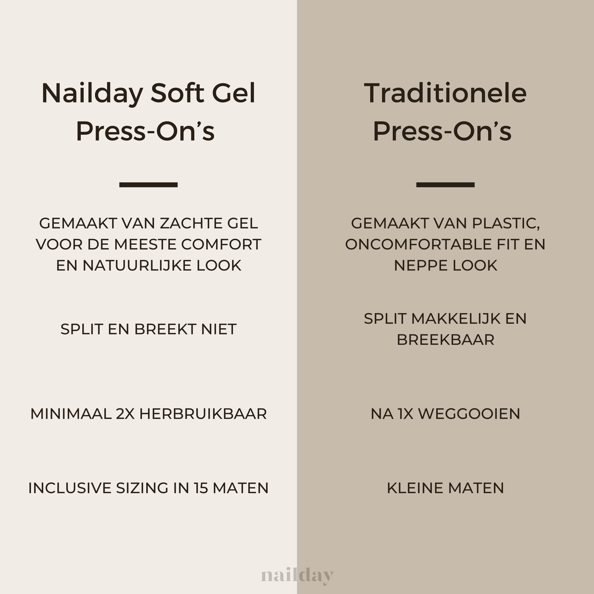 Optie A – Sticky tabs: Verwijder de beschermfolie, plak de tab op je natuurlijke nagel, druk luchtbelletjes weg langs de randen met de houten stick, plaats de press-on op 45° angle bij de nagelriem en druk stevig aan gedurende ~60 seconden.