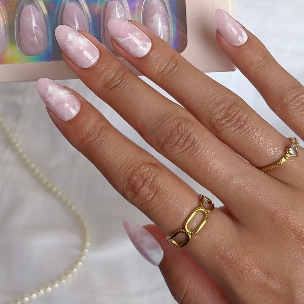 Droom weg met Candy Clouds, een zachte en dromerige manicure die perfect is voor jouw zoete zomermomenten. Deze medium almond press-ons hebben een uniek roze marmer effect dat doet denken aan suikerspinnen in de lucht bij zonsondergang. Elegant, zacht en toch opvallend: de ultieme match voor een minimal maar magische summer look.