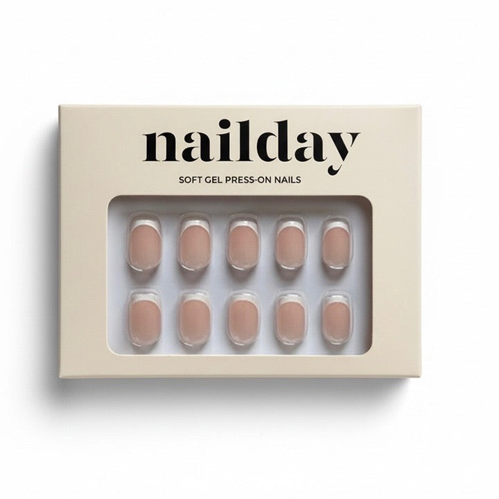 Optie B – Lijm: Breng een dun laagje lijm aan op de natural nagel én op de underside van de press-on; plaats op 45° angle bij de nagelriem, druk aan en houd ~60 seconden goed vast. - Finish & verzorging