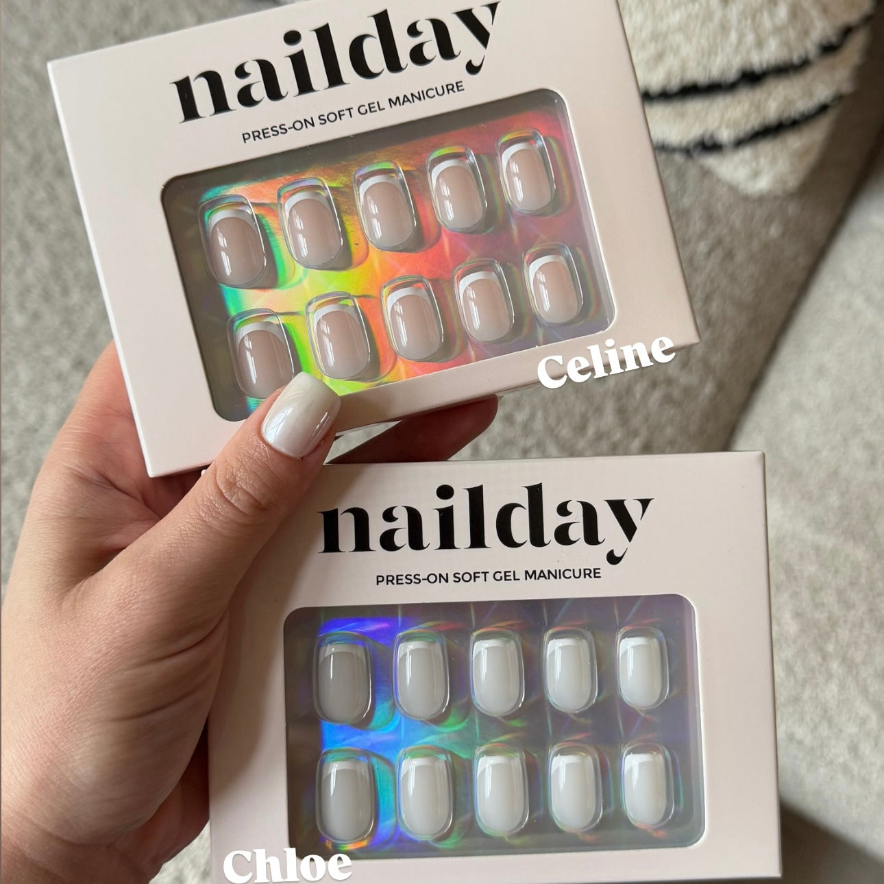 Optie B – Lijm: Breng een dun laagje lijm aan op de natural nagel én op de underside van de press-on; plaats op 45° angle bij de nagelriem, druk aan en houd ~60 seconden goed vast. - Finish & verzorging
