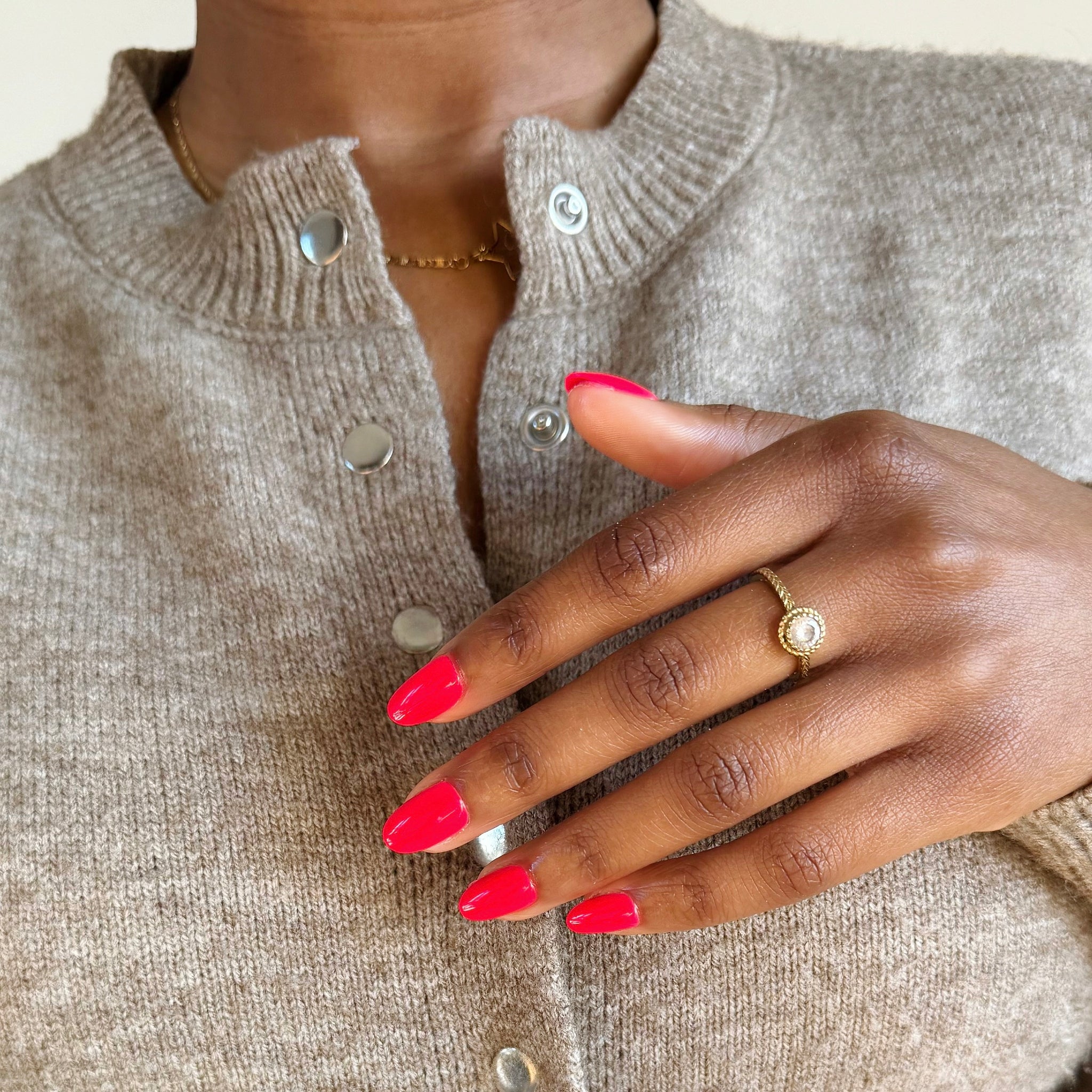 De kleur? Een intens en klassiek rood dat in het echt nóg dieper en krachtiger is dan de camera kan vastleggen. Afgewerkt met een glanzende topcoat voor een echte salonlook – zonder afspraak.