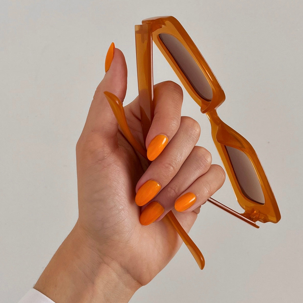 Deze levendige oranje tint geeft elke look een zonnige boost, of je nu op het strand ligt of je dagelijkse outfit wat extra flair wilt geven. De short oval vorm zorgt voor een flatterende en moderne uitstraling.